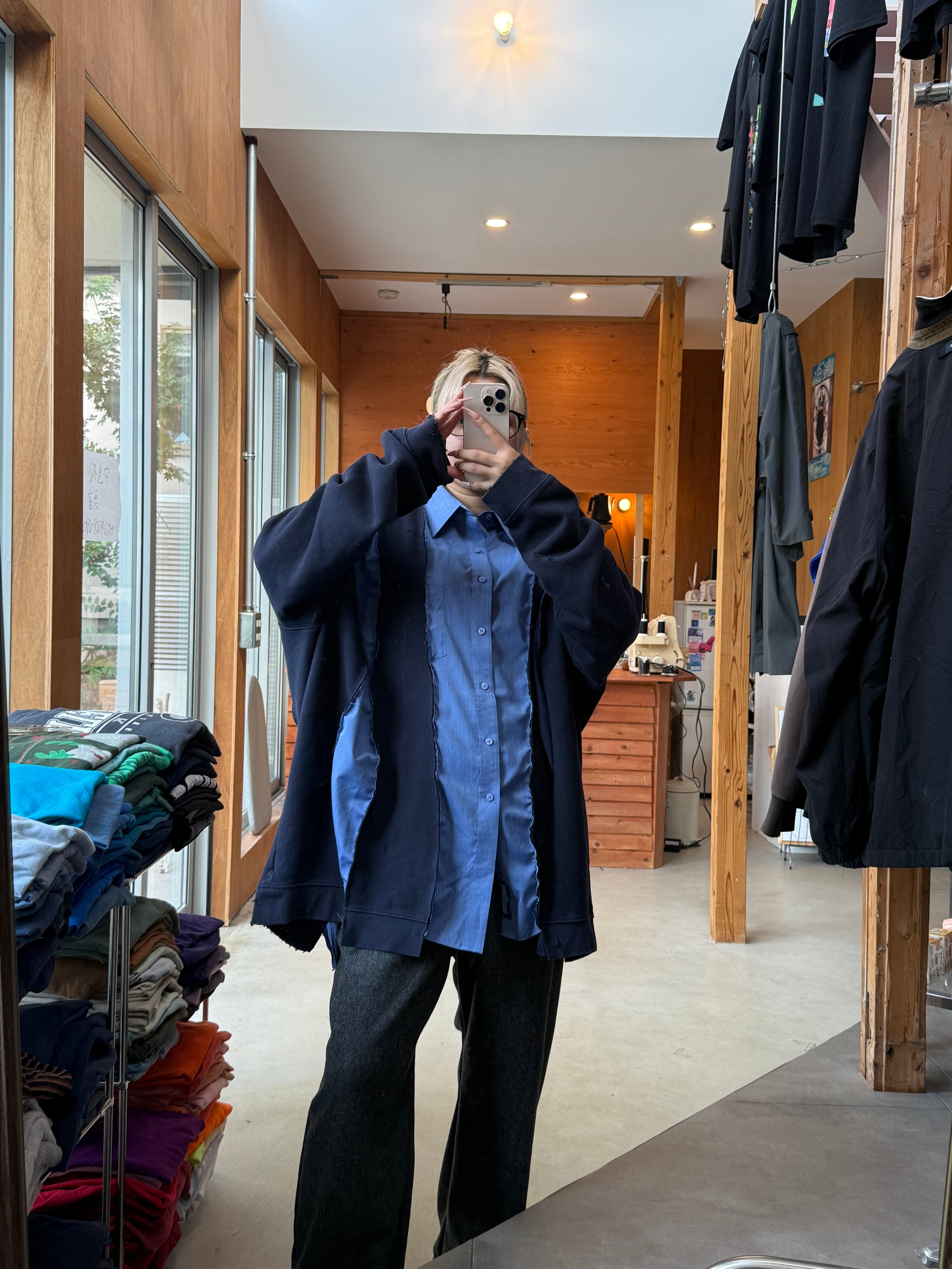 古着のリメイクアイテムとなっております。デザイナー/ HIROSHI YOSHIDA による一点物のアイテム、一つ一つデザイナー自身が縫製を施しております。