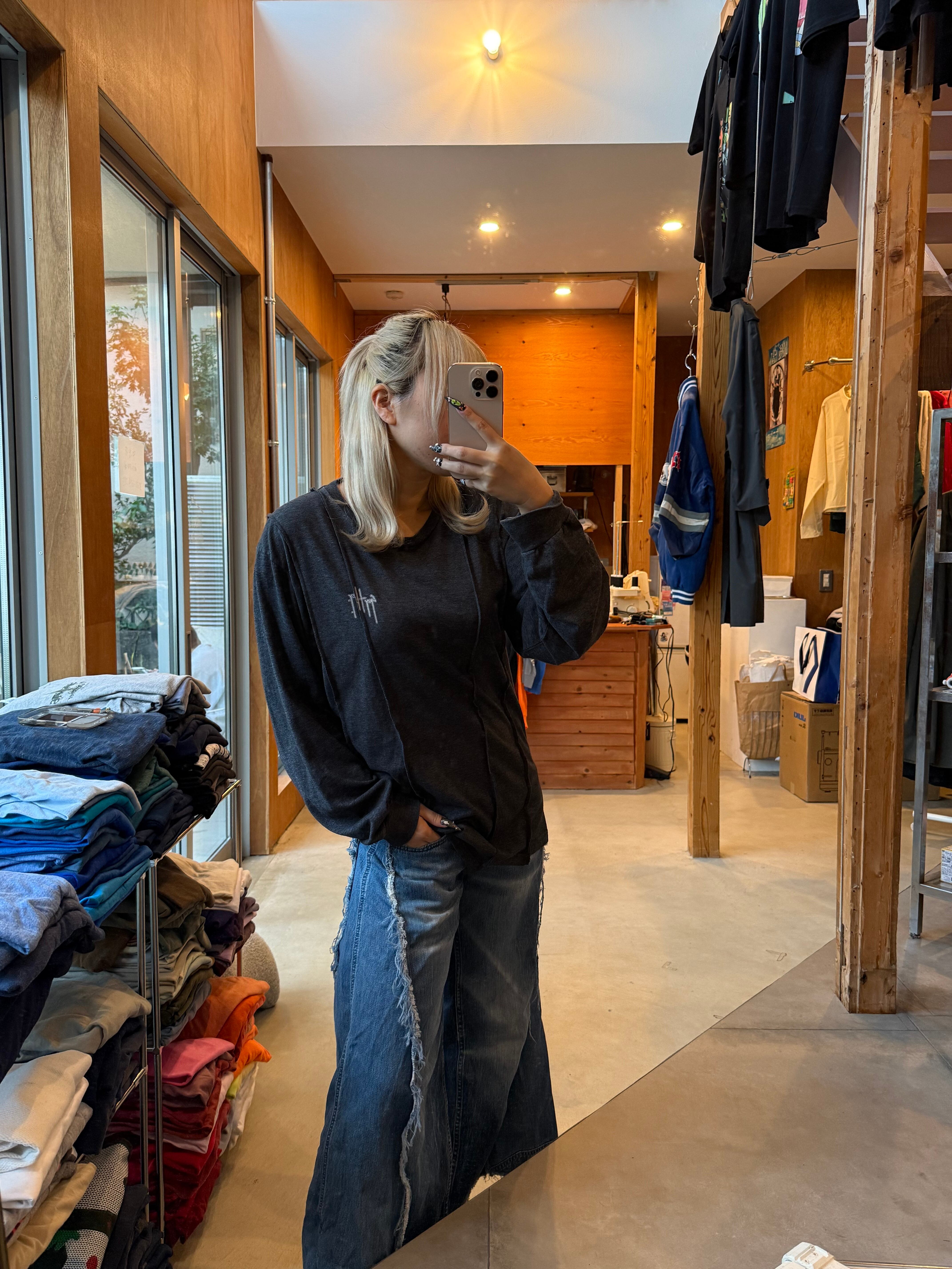 古着のリメイクアイテムとなっております。デザイナー/ HIROSHI YOSHIDA による一点物のアイテム、一つ一つデザイナー自身が縫製を施しております。